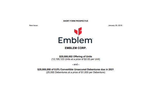 TORONTO, Feb. 02, 2018 (GLOBE NEWSWIRE) — Emblem Corp. (TSXV:EMC) (EMC.WT) (“Emblem” or the “Company”) is pleased to announce that it has closed its previously announced bought deal short form prospectus offering, including the exercise in full of the Underwriters’ (as defined below) over-allotment option (the “Offering”). In connection with the Offering, the Company issued 14,024,391 units of the Company (the “Units”) and 25,000 8.0% convertible unsecured debentures of the Company due in 2021 (the “Convertible Debentures”). The Units were sold at a price per Unit of $2.05 for gross proceeds of $28,750,001.55 and the Convertible Debentures were sold at a price per Convertible Debenture of $1,000 for gross proceeds of $25,000,000, for total aggregate gross proceeds of $53,750,001.55. The Offering was underwritten by a syndicate of underwriters led by Eight Capital and included Canaccord Genuity Corp., Echelon Wealth Partners Inc. and GMP Securities L.P. (collectively, the “Underwriters”).