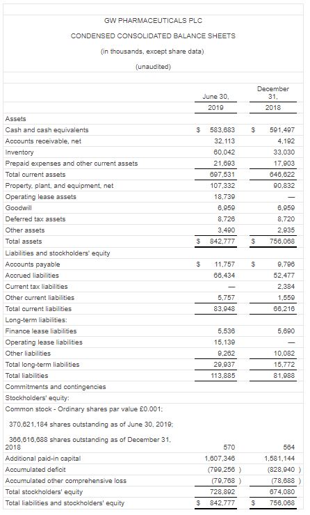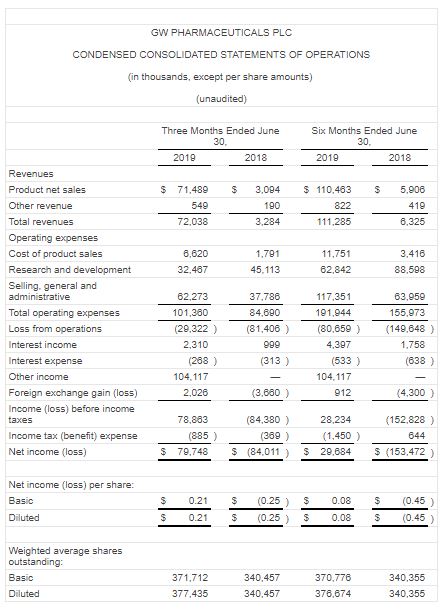 GW Pharmaceuticals plc Reports Financial Results and Operational Progress for the Second Quarter Ended June 30, 2019