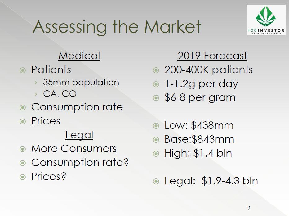The 4-year outlook is based upon the assumptions in for patient count, consumption rate and pricing. Canada has a population of about 90% of California’s and 7X of Colorado’s. 2% of the population would be 700K, suggesting that these assumptions could prove conservative. A legal market would be much larger but the consumption rates would likely be much lower on a per capita basis.