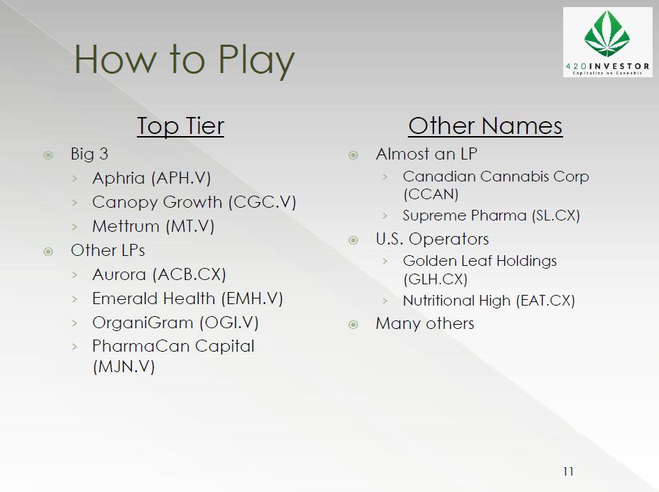 The Big 3 include Canopy Growth (Tweed, Bedrocan), Mettrum and Aphria. There are several other publicly-traded LPs, including Aurora (not yet licensed to sell), Emerald Health, OrganiGram and PharmaCan Capital (which has stake in 5 LPs), as well as some that are close to being an LP (Canadian Cannabis Corp is acquiring Hydropothecary, but it hasn’t closed yet, while Supreme Pharma is one of a handful of companies awaiting inspection). Golden Leaf Holdings and Nutritional High are domiciled in Canada while operating in the United States.