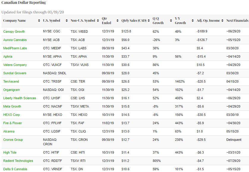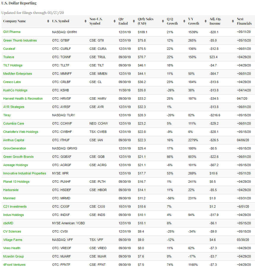 The Public Cannabis Company Revenue & Income Tracker, managed by New Cannabis Ventures, ranks the top revenue producing cannabis stocks that generate industry sales of more than US$7.5 million per quarter (C$10.5 million). This data-driven, fact-based tracker will continually update based on new financial filings so that readers can stay up to date. Companies must file with the SEC or SEDAR to be considered for inclusion. Please note that we raised the minimum quarterly revenue in May 2019 from US$2.5 million and from US$5.0 million in October 2019.