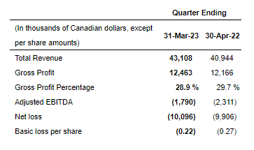 Adjusted EBITDA for the first quarter ended March 31, 2023 was negative $1.8 million, an improvement of 22.5% compared to negative adjusted EBITDA of $2.3 million for the comparable quarter of the 2022 fiscal year.