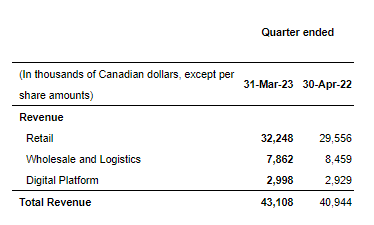 - Consolidated revenue of $43.1 million for Q1 2023, representing a 5.3% increase from $40.9 million in Q1 2022. The year-over-year increase was driven by higher retail revenues for the period.