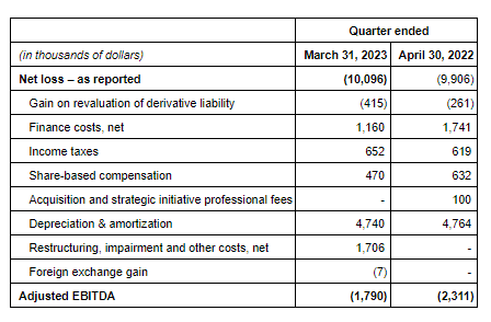 “Adjusted EBITDA” is a is a Non-IFRS metric used by management that does not have any standardized meaning prescribed by IFRS and may not be fully comparable to similar measures presented by other companies. Management defines Adjusted EBITDA as the income (loss) for the period, as reported, before income taxes and other expense (income) items such as finance costs, finance income, gains and losses related to derivative liability revaluations and debt extinguishments, and adjusted for share-based compensation, depreciation and amortization, impairment expenses, restructuring charges and acquisitions, foreign exchange differences and strategic initiative professional fees.