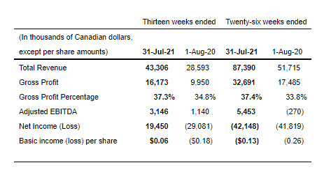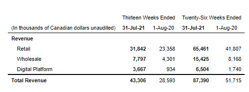 - Same-store sales decreased 14% for forty-eight (48) stores in operation during the comparable period in Q2 2021 due to a surge in newly licensed retail cannabis stores in Ontario, from 665 at May 1, 2021 to 981 at July 31, 2021