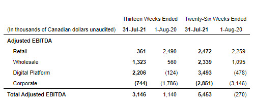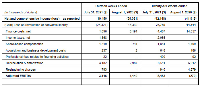 Adjusted EBITDA for the fiscal second quarter ended July 31, 2021 was $3.1 million compared to Adjusted EBITDA of $1.1 million for the thirteen weeks ended August 1, 2020.