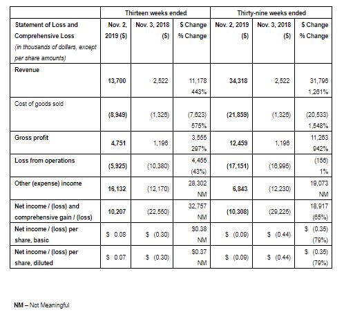 The Company recorded net comprehensive income of $10.2 million, or net income per share of $0.08 or $0.07 on a fully diluted basis for the thirteen weeks ended November 2, 2019. Net income for the quarter was attributable to accounting gains recorded in other income on the revaluation of the derivative liabilities associated with the convertible debentures.