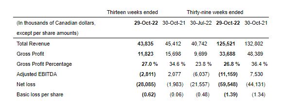 - Gross profit of $11.8 million (27% of revenue) for Q3 2022, compared to $9.7 million (24% of revenue) in the previous quarter and $15.7 million (35% of revenue) in the prior year comparative period. The sequential increase in gross profit dollars and margin percentage reflect our continued improvement in Retail operational and financial metrics and improvements in the Hifyre digital platform during the current fiscal quarter.