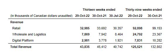 - Revenue of $43.8 million for Q3 2022, representing an increase of 8% from $40.7 million in the previous quarter and a decrease of 3% from $45.4 million in the prior year comparative period. The quarter-over-quarter improvement was driven by growth in Retail and Digital segments sales offset by a moderate decrease in Wholesale & Logistics.