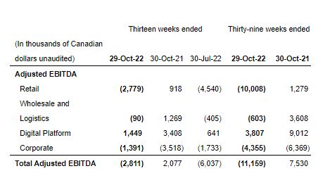 - The current fiscal quarter and year results include the operations of Open Fields Distribution wholesale business in the province of Saskatchewan and Pineapple Express Delivery, which was acquired on January 21, 2022.