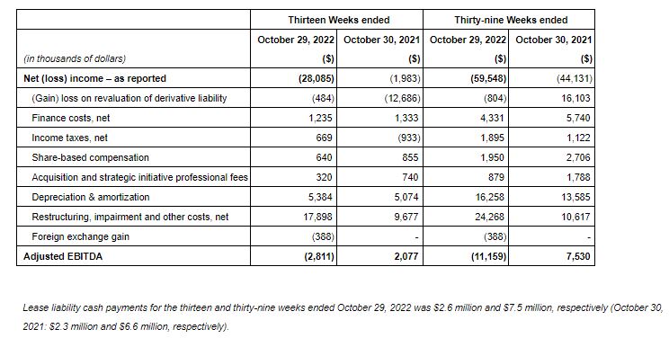 “Adjusted EBITDA” is a is a Non-IFRS metric used by management that does not have any standardized meaning prescribed by IFRS and may not be fully comparable to similar measures presented by other companies. Management defines Adjusted EBITDA as the income (loss) for the period, as reported, before income taxes and other expense (income) items such as finance costs, finance income, gains and losses related to derivative liability revaluations and debt extinguishments, and adjusted for share-based compensation, depreciation and amortization, impairment expenses, restructuring charges and acquisitions, foreign exchange differences and strategic initiative professional fees.
