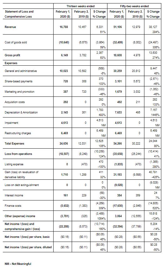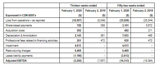 The Company’s “Adjusted EBITDA” is a Non-IFRS metric used by management that does not have any standardized meaning prescribed by IFRS and may not be comparable to similar measures presented by other companies. Management defines the Adjusted EBITDA as the Income (loss) for the period, as reported, before accretion and interest, tax, and adjusted for removing the share-based compensation expense, depreciation and amortization, gains and losses related to derivative liability revaluations and debt extinguishments, professional fees associated with financing and acquisition and business development activities, impairment charges, restructuring costs, and includes lease liability payments that would have been excluded from profit and loss due to the application of IFRS 16 accounting standards. Management believes “Adjusted EBITDA” is a useful financial metric to assess its operating performance on a cash basis before the impact of non-cash items. As other companies may calculate this non-IFRS measures differently than the Company, this metric may not be comparable to similarly titled measures reported by other companies. For a reconciliation of Adjusted EBITDA please refer to “Non-IFRS Financial Measures” in the Company’s management discussion and analysis for the fifty-two weeks ended February 1, 2020.