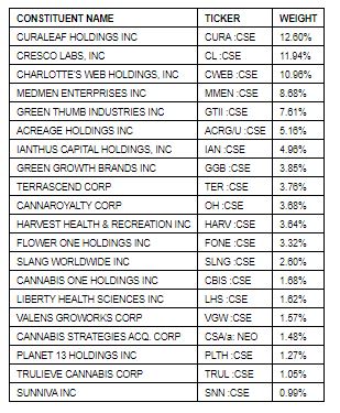 The Underlying Index is designed to provide exposure to the performance of a basket of publicly-listed companies having significant business activities in, or significant exposure to, the marijuana or hemp industries in the United States. Constituent companies will primarily include those with business activities as a producer, developer, or supplier of marijuana or hemp-based products, and can also include investment companies focused on investments in the Marijuana or Hemp industries, or companies with businesses ancillary to the Marijuana or Hemp industries.