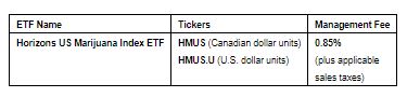 TORONTO, April 15, 2019 /CNW/ – Horizons ETFs Management (Canada) Inc. (“Horizons ETFs”) is pleased to announce that it has filed its final prospectus to launch the Horizons US Marijuana Index ETF. Units of the exchange traded fund (“HMUS” or the “ETF”) have been conditionally approved for listing by the NEO Exchange (“NEO”) and are slated to begin trading on April 18, 2019, under the ticker symbols HMUS (Canadian dollar units) and HMUS.U (U.S. dollar units).