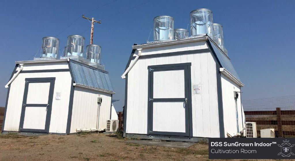 One of the most interesting panels at the recent New West Summit was a presentation by Dr. Jonathan Cachat of Fleurish Farms about new sunlight capture cultivation technology that Fleurish Farms is applying to the cannabis industry, DSS SunGrown Indoor™, which we first wrote about in August. The company has created and tested a hybrid solution to growing that has the advantages of growing indoors but at a dramatically lower cost due to the use of natural sunlight that is converted into lighting and supplemented by Heliospectra LEDs. The technology, pictured below, involves using cylinders to capture the sunlight, transfer and control it and then deliver it uniformly to the plants, a solution that differs greatly from hybrid greenhouses with glass roofing.