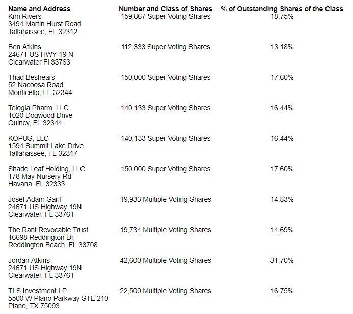 The following Super Voting Shares and Multiple Voting Shares of Trulieve were issued in connection with the Transaction: