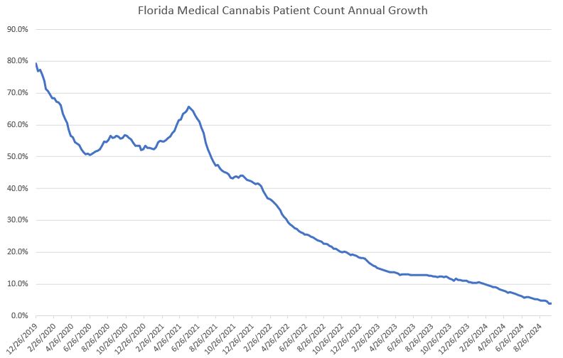 We last updated on the Florida market a month ago, and the annual growth in patient count had fallen to 4.8% in early September from 8.4% in late May. The rate has dropped to a new record low and was 3.9% this past week: