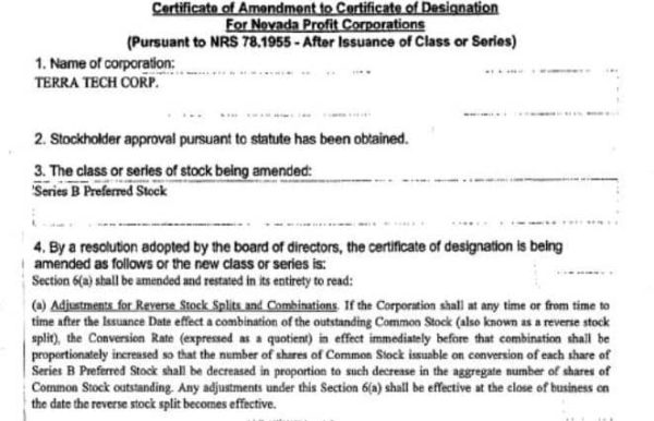 Last year, New Cannabis Ventures was highly critical of a proposal by Terra Tech (OTC: TRTC) for shareholder vote that would have protected a certain class of shareholders from a potential reverse-split to be applied to common shares. The company quickly rescinded the proposal after our article and then suggested that it would change the terms of the B Preferred shares in late September.