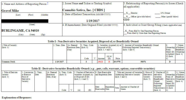 We have written previously about the rampant insider selling at cannabis companies in general and at Cannabis Sativa (OTC: CBDS) in particular. While it’s not his first sale, CBDS CEO Mike Gravel, the 86-year old former U.S. Senator from Alaska, scored big as reported in a SEC Form 4 filing posted earlier this week.