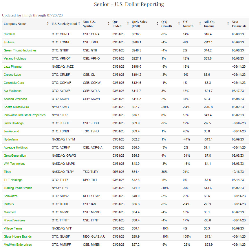 Among the larger companies, all reports are due by mid-August. The 4 largest MSOs have all announced times for their Q2 calls, including Curaleaf (OTC: CURLF) (CSE: CURA), Trulieve (OTC: TCNNF) (CSE: TRUL), Green Thumb Industries (OTC: GTBIF) (CSE: GTI) and Verano Holdings (OTC: VRNOF) (CSE: VRNO).