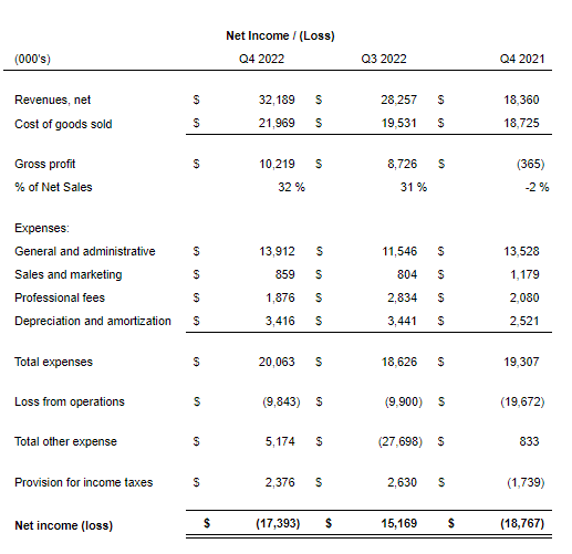 - Net Sales of $32.2 million increased 75% from $18.4 million in Q4 2021 and 14% sequentially from $28.3 million in Q3 2022.