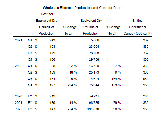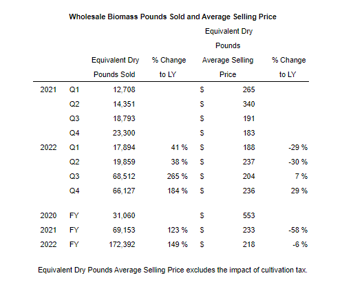 Wholesale biomass revenue was $41.4 million, increasing 87% versus 2021. Product sold increased 149% year-on-year to over 172,000 pounds of equivalent dry weight.1 The increase in weight available for sale was driven by a 98% increase in production versus last year as a result of incremental production from the Company’s SoCal Farm in the second half of the year.