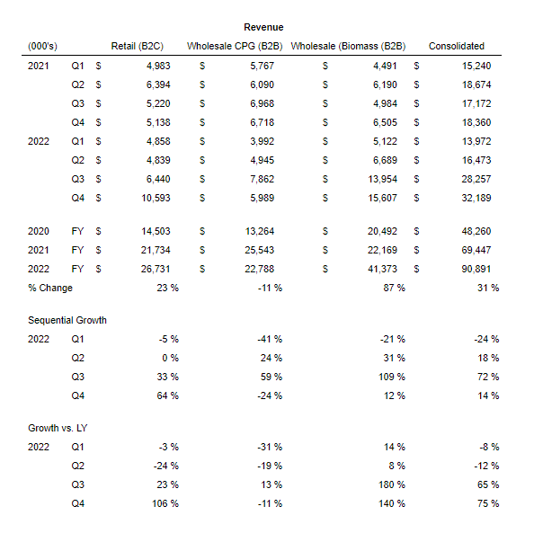 - The Company has provided guidance that 2023 revenues will reach $160 million. The statement assumes the following in revenues from each source: 1) Annualized wholesale biomass sales of $85 million; 2) Annualized retail revenues of $50 million; 3) Annualized wholesale CPG revenues of $25 million.