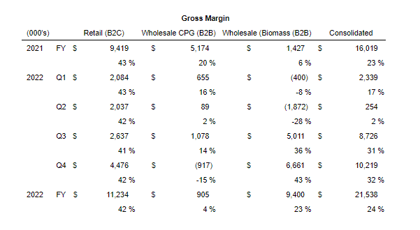 Wholesale CPG revenues were $22.8 million and fell 11% versus 2021. The addition of PLUS Products starting in May helped buoy results for what was otherwise a very challenging year, as inflation dampened customer demand and led to intensified price competition amongst brands. Additionally, issues with strain selection and excess inventory in the first half of the year resulted in a loss of momentum for the business and heavy price discounting.