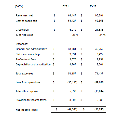 Gross profit was $21.5 million, or 24% of net revenue, compared to $16.0 million and 23% of net revenue in 2021. The increase in gross margin was primarily due to an 87% increase in wholesale biomass revenue combined with a 24% decrease in the cost of production for biomass driven by output from the SoCal Farm.