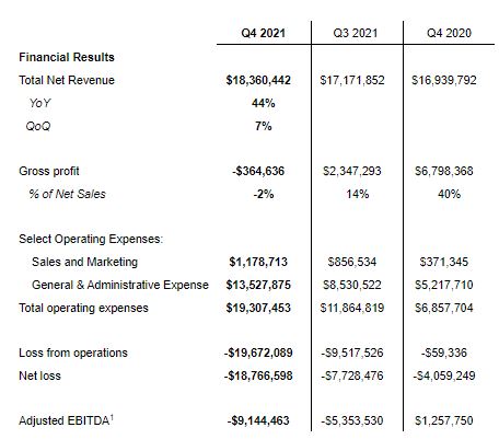 Adjusted EBITDA1 was a loss of $9.1 million in Q4 2021 compared to a loss of $5.4 million in Q3 2021 and $1.3 million gain in Q4 2020. The sequential decrease of $3.8 million was primarily caused by lower wholesale pricing and inventory reserves in Q4 2021 that negatively impacted gross margin.