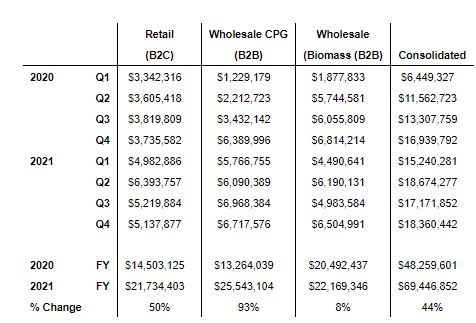 Revenue was $18.4 million, an 8% increase compared to Q4 2020 and a 7% increase compared to Q3 2021. The sequential revenue growth was driven by wholesale biomass sales, which increased 31% over Q3 2021. Performance by business line was: