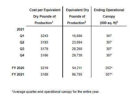 1 Cost per Equivalent Dry Pound of Production (“CEDPP”), Adjusted EBTIDA and Adjusted EBITDA Margin are non-GAAP financial measure and are not standard GAAP financial measures used to in the Company’s financial reporting framework. CEDPP is used to track the Company’s cultivation performance with respect to cost of production and to provide insight into production costs over time and with respect to expansion of the Company’s cultivation footprint. EBITDA is non-GAPP financial metric and is earnings less interest, depreciation taxes and amortization. EBITDA is used to track Company an aspect of Company performance. Adjusted EBITDA is EBITDA less non-recurring costs. Adjusted EBITDA and Adjusted EBITDA Margin are metrics are used to track the Company’s performance and can be used to assess performance and value under different regulatory structures. Adjusted EBITDA Margin is Adjusted EBITDA divided by revenue. CEDPP is the application of a subset of Costs of Goods Sold for biomass production (including all expenses from nursery and cultivation to curing and trimming – the point at which product is ready for sales as wholesale Cannabis or to be transferred to CPG) applied to the Company’s metric of dry production which includes all dry production (flower, smalls and trim) plus equivalent dry weight for wet weight and fresh frozen that is not converted into dry goods by the Company.