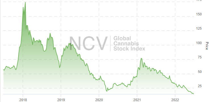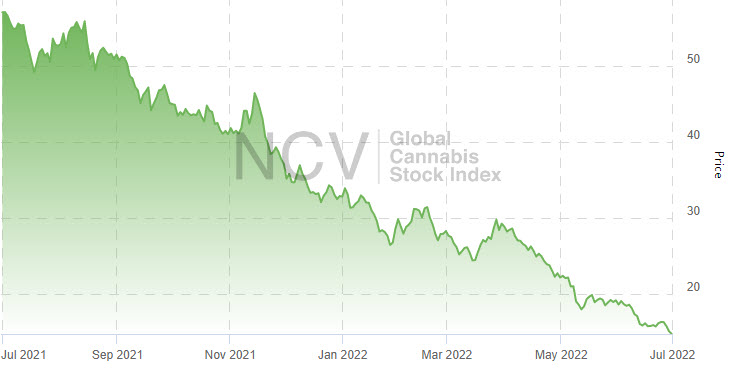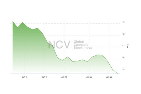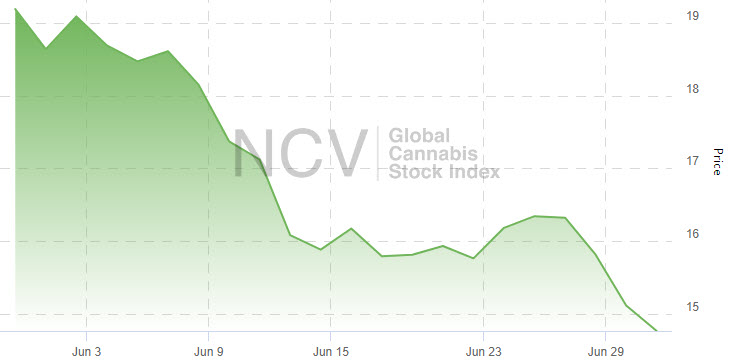 The Global Cannabis Stock Index was beaten up in June, its 16th consecutive monthly decline. It closed at the lowest close ever as the index fell 23.1% to 14.76.