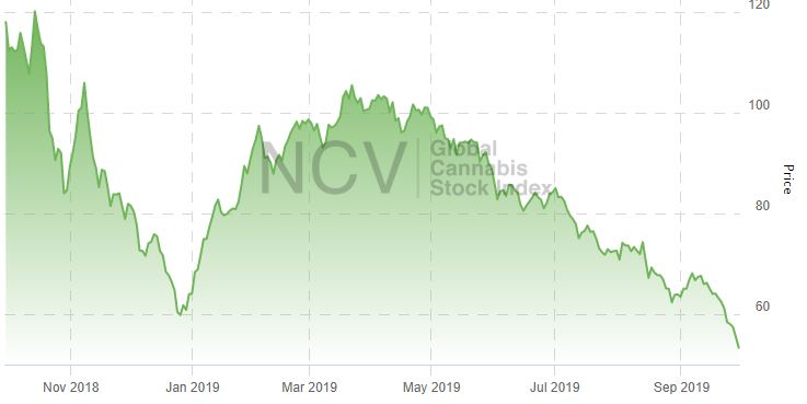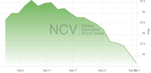 After a 57.4% gain in Q1 followed by a pullback that had left it down 1% year-to-date as of the end of August, the Global Cannabis Stock Index moved sharply lower again in September, declining 16.0% to 53.25:
