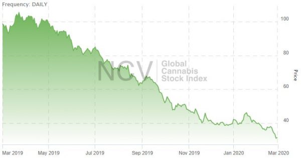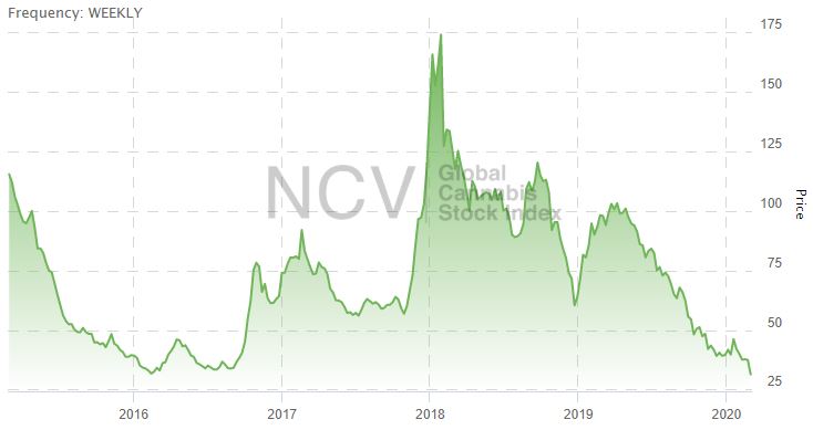 After breaking an 8-month losing streak in December with a strong close on the last day of the year, the Global Cannabis Stock Index extended its January losses with a 21.5% decline during February, ending at 31.41: