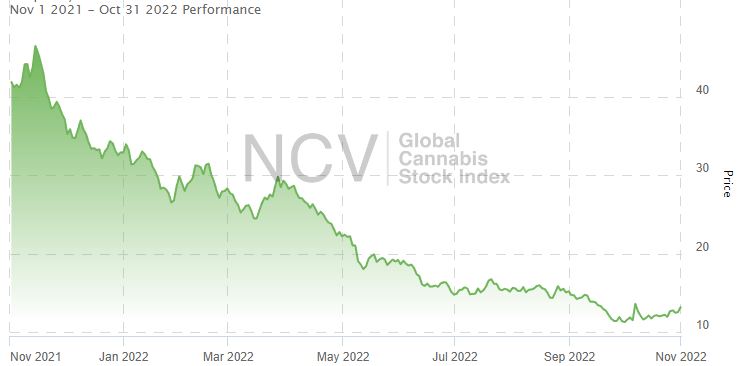 Since the peak in February 2021, the Global Cannabis Stock Index has dropped 83.7% from the 81.01 closing high: