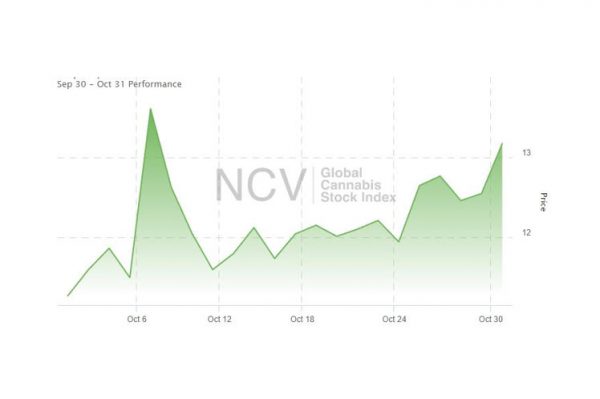 After breaking a long negative streak in July of 17 straight months down and then a rally of 4.3%, the Global Cannabis Stock Index fell 1.3% in August. In September, it posted a new all-time closing low on 9/30 at 11.26 and ended the month down 25.9%. In October, the index lifted sharply, rising 17.1% to 13.18: