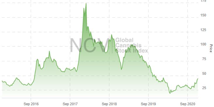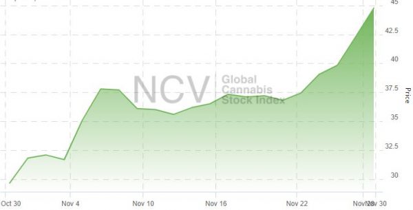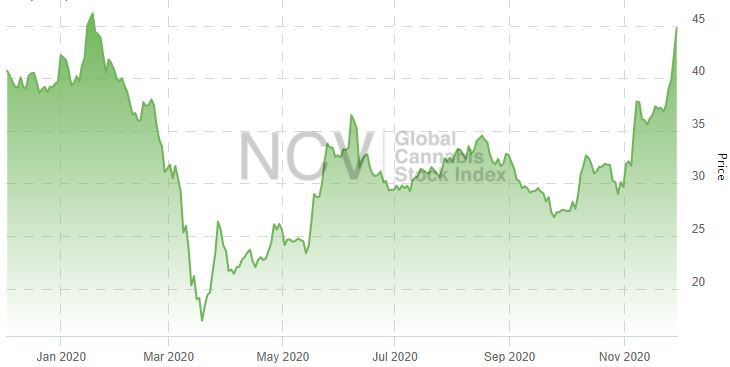 After a sharp decline in September that left the index down 7% in Q3, the Global Cannabis Stock Index extended strong October gains, soaring 50.8% in November to 44.77: