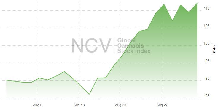 Cannabis stocks, as measured by the Global Cannabis Stock Index, rallied sharply in August, climbing 24.4% after having set a 2018 low on August 14th: