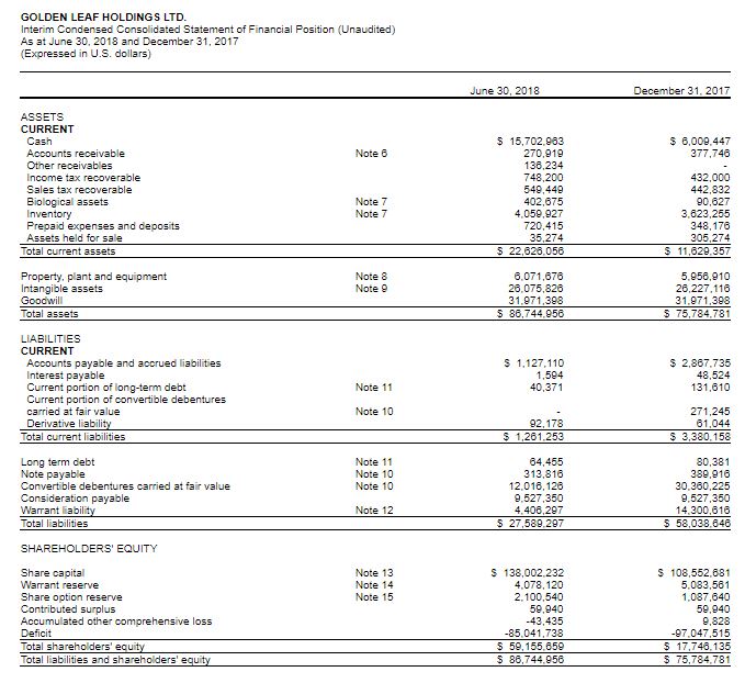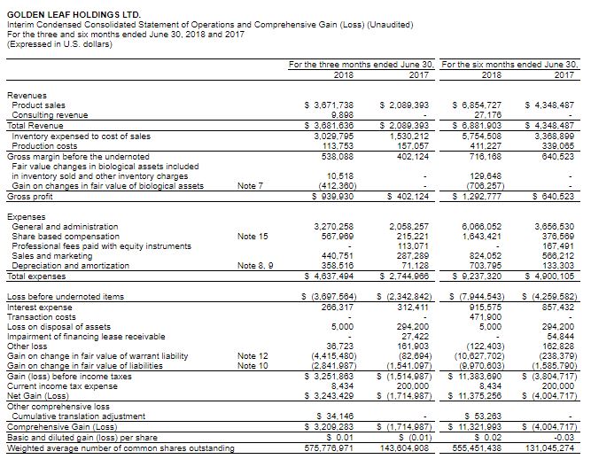 TORONTO, Aug. 29, 2018 (GLOBE NEWSWIRE) — Golden Leaf Holdings Ltd. (“Golden Leaf” or the “Company”) (CSE:GLH) (OTCQB:GLDFF), a cannabis company with cultivation, production and retail operations built around recognized brands, today announced financial results for the fiscal second quarter ended June 30, 2018, and a general business update.