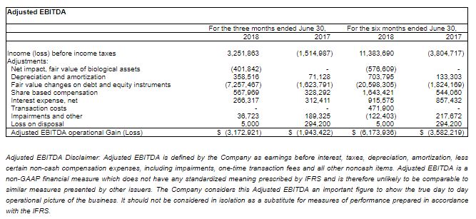 Gross profit was US$940,000 or 26% of net revenue, for Q2 2018, compared with US$402,000 or 19% of net revenue in Q2 2017. Q2 2018 gross margins increased primarily due to the addition of gains on fair market value of biological assets from the Company’s cultivation subsidiary.
