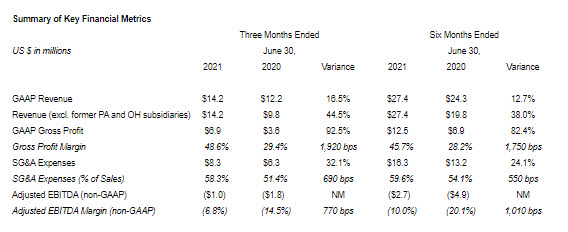 - Total revenue of $14.2 million increased 16.5 percent year-over-year. Excluding results from the Company’s former subsidiaries in Pennsylvania, revenue increased 44.5 percent compared to Q2 2020.