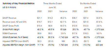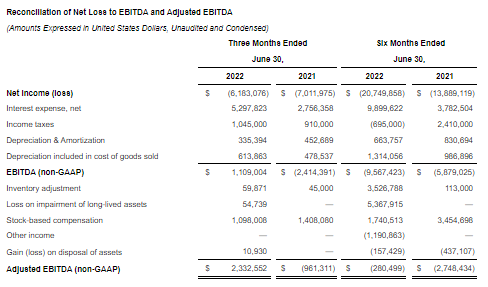 EBITDA, as described in accompanying non-GAAP reconciliation, was $1.1 million during Q2 2022, compared to a loss of $2.4 million in Q2 2021. Adjusted EBITDA was $2.3 million in Q2 2022, as compared to a loss of $1.0 million in Q2 2021. Please refer to the Supplemental Information and Reconciliation of Non-GAAP Financial Measures at the end of this press release for additional information.
