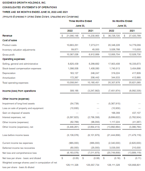 MINNEAPOLIS, Aug. 11, 2022 /PRNewswire/ — Goodness Growth Holdings, Inc. (“Goodness Growth” or the “Company”) (CSE: GDNS; OTCQX: GDNSF), a physician-led, science-focused cannabis company and IP incubator, today reported financial results for its second quarter ended June 30, 2022. All currency figures referenced in this press release reflect U.S. dollar amounts.