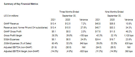 Total revenue was $13.4 million in the third quarter, an increase of 7.2 percent as compared to Q3 2020, including the Company’s former subsidiaries in Pennsylvania and Ohio. Excluding contributions from Pennsylvania and Ohio, revenue increased 27.6 percent. Retail revenue excluding Pennsylvania increased 34.7 percent to $11.6 million in Q3 2021 and reflected growth in each of the Company’s retail markets. Wholesale revenue, excluding Pennsylvania and Ohio declined by 5.0 percent to $1.8 million, driven by the loss of biomass due to atypical weather in the Arizona market, which resulted in a sales decline during the quarter.