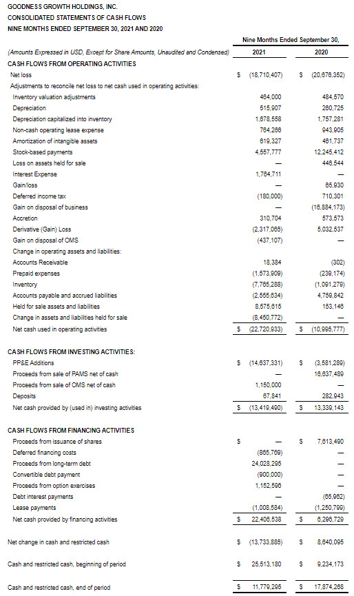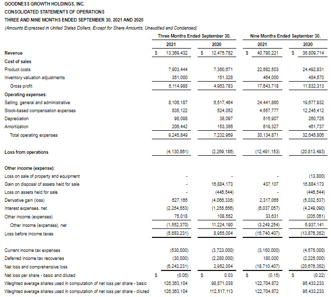 MINNEAPOLIS, Nov. 10, 2021 /PRNewswire/ — Goodness Growth Holdings, Inc. (“Goodness Growth” or the “Company”) (CSE: GDNS; OTCQX: GDNSF), a physician-led, science-focused cannabis company and IP incubator, today reported financial results for its third quarter ended September 30, 2021. All currency figures referenced in this press release reflect U.S. dollar amounts.