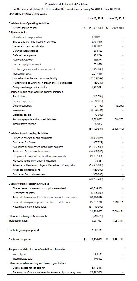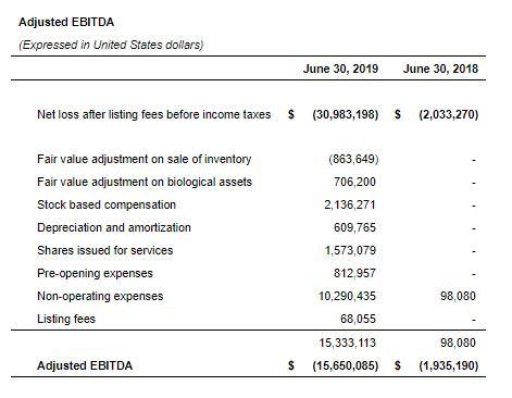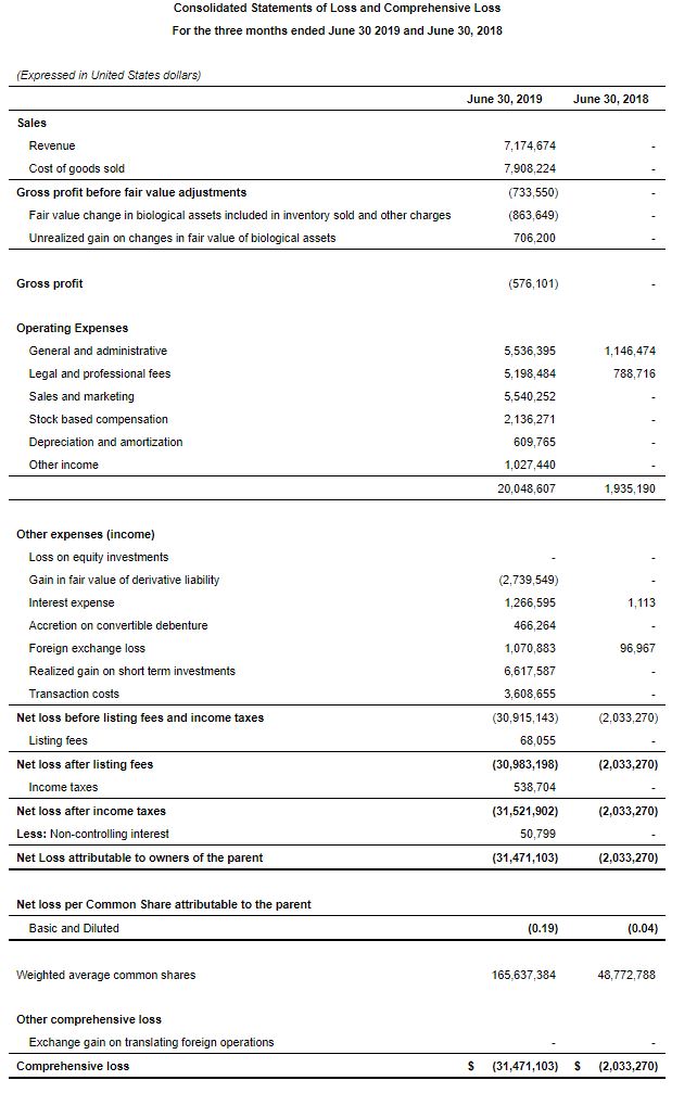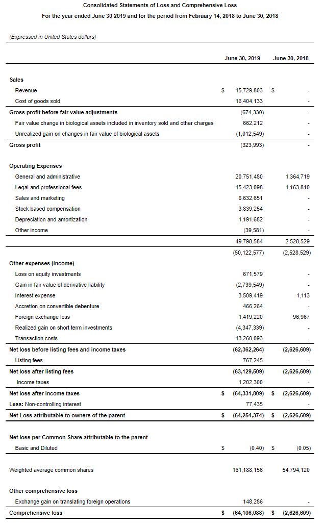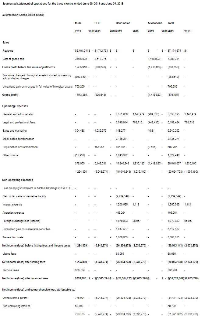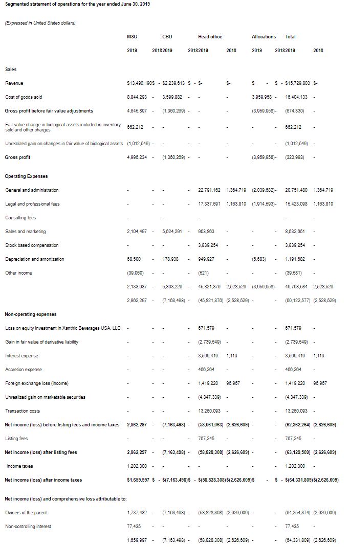 - Total revenue for fiscal 2019 was $15.7 million, which reflects seven and a half months of MSO revenue since the reverse takeover in November 2018 and the launch of the CBD business in February 2019.