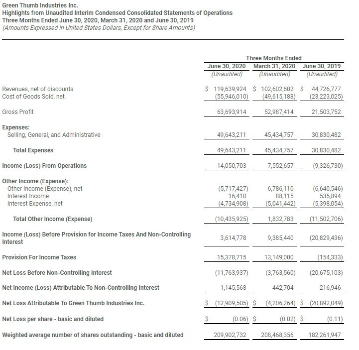 - Net Income (Loss) Attributable to Green Thumb: Net loss attributable to the Company for the second quarter 2020 was $12.9 million or ($0.06) per basic and diluted share.