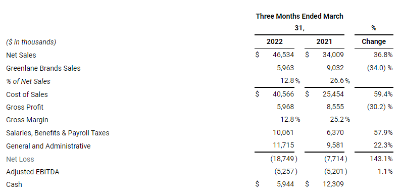 Net sales were $46.5 million in Q1 2022, compared to $34.0 million in Q1 2021, an increase of 37%. The year-over-year increase in net sales was primarily driven by the KushCo merger. Excluding KushCo’s post-merger sales, revenue declined 47% to $18.1 million, compared to $34.0 million for same period in 2021. Third-party brand sales decreased 49% due to our strategy to focus on our proprietary, higher-margin Greenlane Brands.