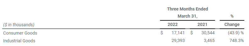 Net sales for our Industrial Goods reporting segment were approximately $29.4 million in Q1 2022, compared to approximately $3.5 million in the same period in 2021. The year-over-year increase was due to the merger with KushCo, which was completed on August 31, 2021.
